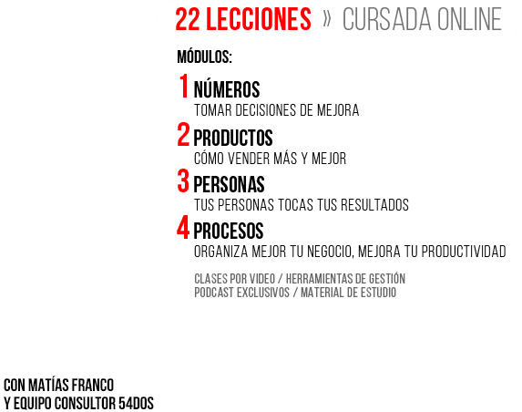 Con el equipo de consultores de Tienda54dos buscamos ayudarte. Esa es nuestra esencia. Todo lo que hacemos, y cada diplomatura es 100% práctica. No son clases. Asumimos el rol de Tu Socio. Vamos al hueso. Tomamos con vos, decisiones múltiples de mejora en todas las direcciones de tu negocio, (financieras, comerciales, de marketing, y de estructura). Nos enfocamos en mejorar resultados desde el primer momento. Trabajamos basados en nuestro propio modelo de negocio de 4 pasos: Números. Productos. Personas. Procesos. Te aportamos nuestros más de 10 años de experiencia en consultoría y gestión pyme. Y te sumamos los casos de más de 10 mil emprendedores y 100 empresas pymes por año, que mejoraron resultados a través de alguna de nuestras diplomaturas.