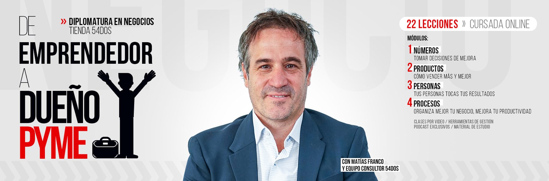 Dinámica 24/7, todo el año, para que definas tu ritmo. Con programas únicos desarrollados por el equipo de consultores 54dos. Los programas de las clases son un complemento de Videos + Materiales en PDF + Webinars + Podcast + Ebook Dueño Pyme.