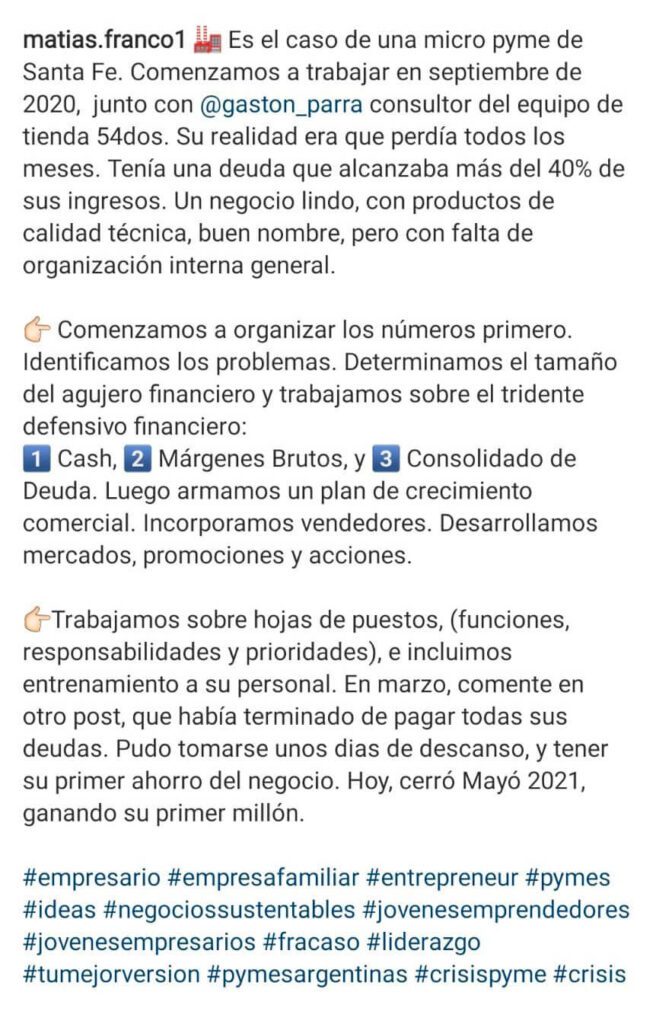 Con el equipo de consultores de Tienda54dos buscamos ayudarte. Esa es nuestra esencia. Todo lo que hacemos, y cada programa es 100% práctico. No son clases. Asumimos el rol de Tu Socio. Vamos al hueso. Tomamos con vos, decisiones múltiples de mejora en todas las direcciones de tu negocio, (financieras, comerciales, de marketing, y de estructura). Nos enfocamos en mejorar resultados desde el primer momento. Trabajamos basados en nuestro Método propio de gestión Pyme de 4 pasos: Números. Productos. Personas. Procesos. Te aportamos nuestros más de 10 años de experiencia en consultoría y gestión pyme. Y te sumamos los casos de más de 10 mil emprendedores y 100 empresas pymes por año, que mejoraron resultados a través de alguno de nuestros programas.