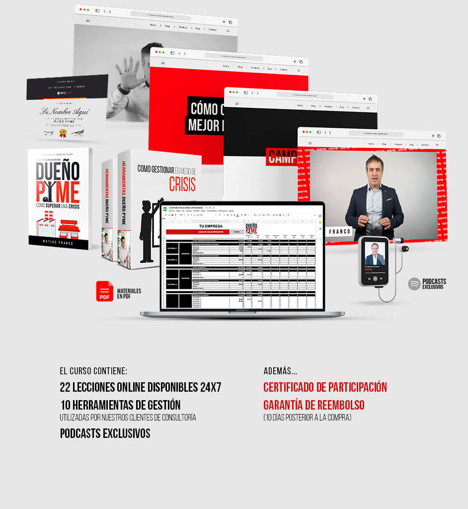 Te brindaremos más de 22 lecciones en videos para que los veas cuando desees,material en PDF, podcast exclusivos y las mismas herramientas de gestión que utilizamos con nuestros clientes para que las puedas aplicar a tu negocio desde el primer día.